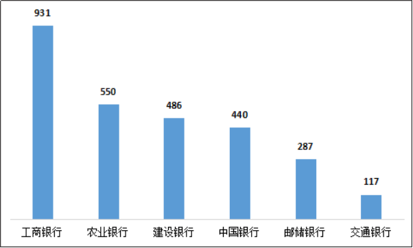1.工商银行、农业银行、建设银行的个人贷款业务投诉量位居国有大型商业银行前三名。国有大型商业银行个人贷款业务投诉量的中位数为463件。其中,工商银行931件,占工商银行投诉总量的23.2%;农业银行550件,占农业银行投诉总量的21.8%;建设银行486件,占建设银行投诉总量的14.9%;中国银行440件,占中国银行投诉总量的5.2%;邮储银行287件,占邮储银行投诉总量的13.1%;交通银行117件,占交通银行投诉总量的3.8%。