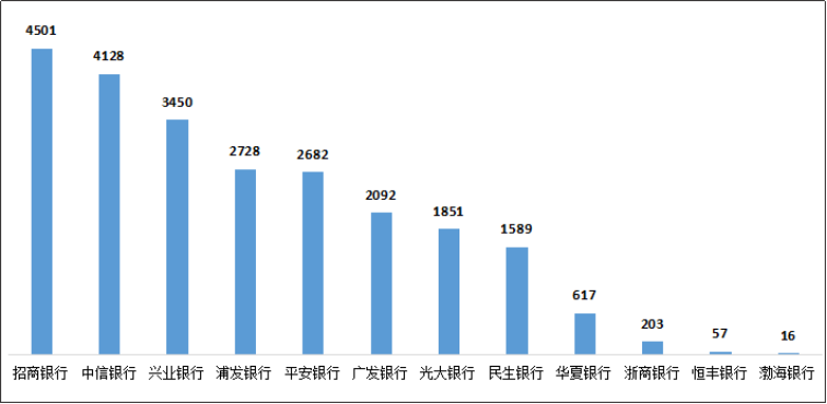 2.招商银行、中信银行、兴业银行的信用卡业务投诉量位居股份制商业银行前三名。股份制商业银行信用卡业务投诉量的中位数为1971.5件。其中,招商银行4501件,占招商银行投诉总量的85.7%;中信银行4128件,占中信银行投诉总量的92.6%;兴业银行3450件,占兴业银行投诉总量的91.0%;浦发银行2728件,占浦发银行投诉总量的75.8%;平安银行2682件,占平安银行投诉总量的74.6%;广发银行2092件,占广发银行投诉总量的90.9%;光大银行1851件,占光大银行投诉总量的78.8%;民生银行1589件,占民生银行投诉总量的78.9%;华夏银行617件,占华夏银行投诉总量的79.1%;浙商银行203件,占浙商银行投诉总量的78.1%;恒丰银行57件,占恒丰银行投诉总量的52.8%;渤海银行16件,占渤海银行投诉总量的15.8%。