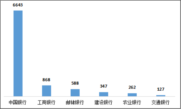 1.中国银行、工商银行、邮储银行的理财类业务投诉量位居国有大型商业银行前三名。国有大型商业银行理财类业务投诉量的中位数为467.5件。其中,中国银行6643件,占中国银行投诉总量的79.1%;工商银行868件,占工商银行投诉总量的21.6%;邮储银行588件,占邮储银行投诉总量的26.8%;建设银行347件,占建设银行投诉总量的10.6%;农业银行262件,占农业银行投诉总量的10.4%;交通银行127件,占交通银行投诉总量的4.1%。