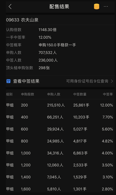 作为国内包装饮用水的龙头企业,农夫山泉此次认购也异常火爆。公开发售阶段,农夫山泉获1148.3倍认购,申购人数达707532人,冻资6777亿港元,成为史上最大冻资王。