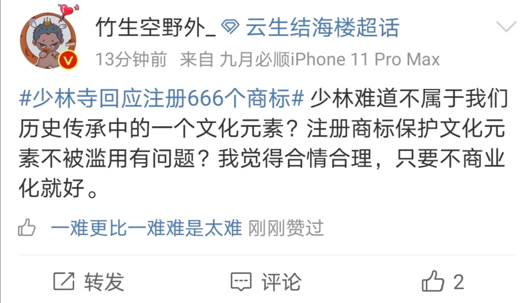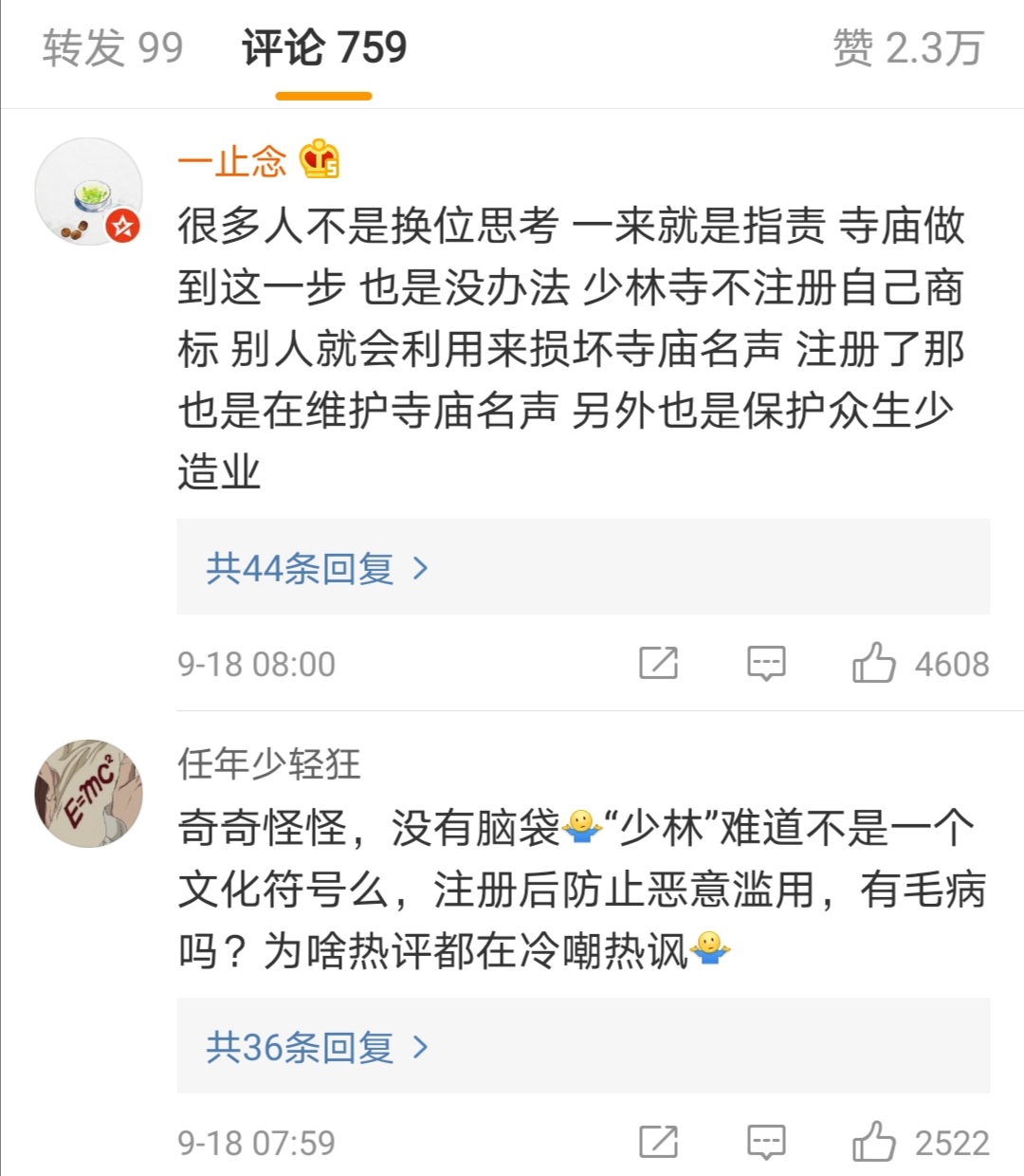 对此,少林寺回应,少林寺的名称曾被人滥用,推出所谓“少林秘方”等,注册商标是为了保护少林品牌。