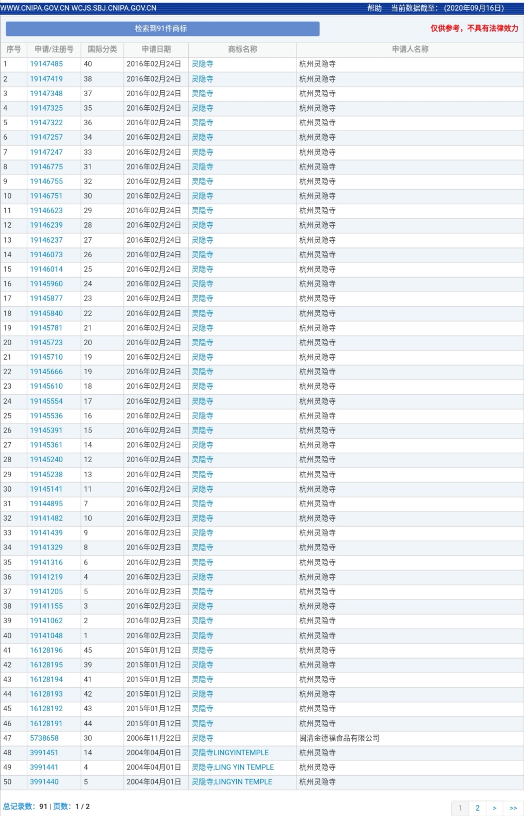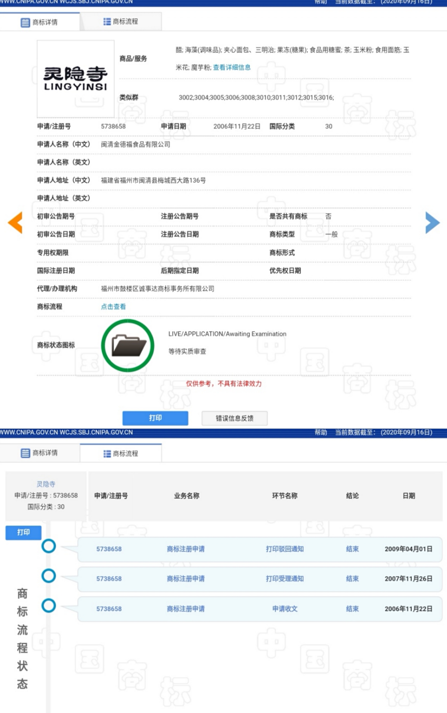 记者注意到,有一些公司和个人尝试注册带有著名寺院名称的商标,但多被驳回。比如,福建一家食品公司提交了“灵隐寺”商标的注册申请,商品服务为果冻、三明治等,但最终申请被驳回。