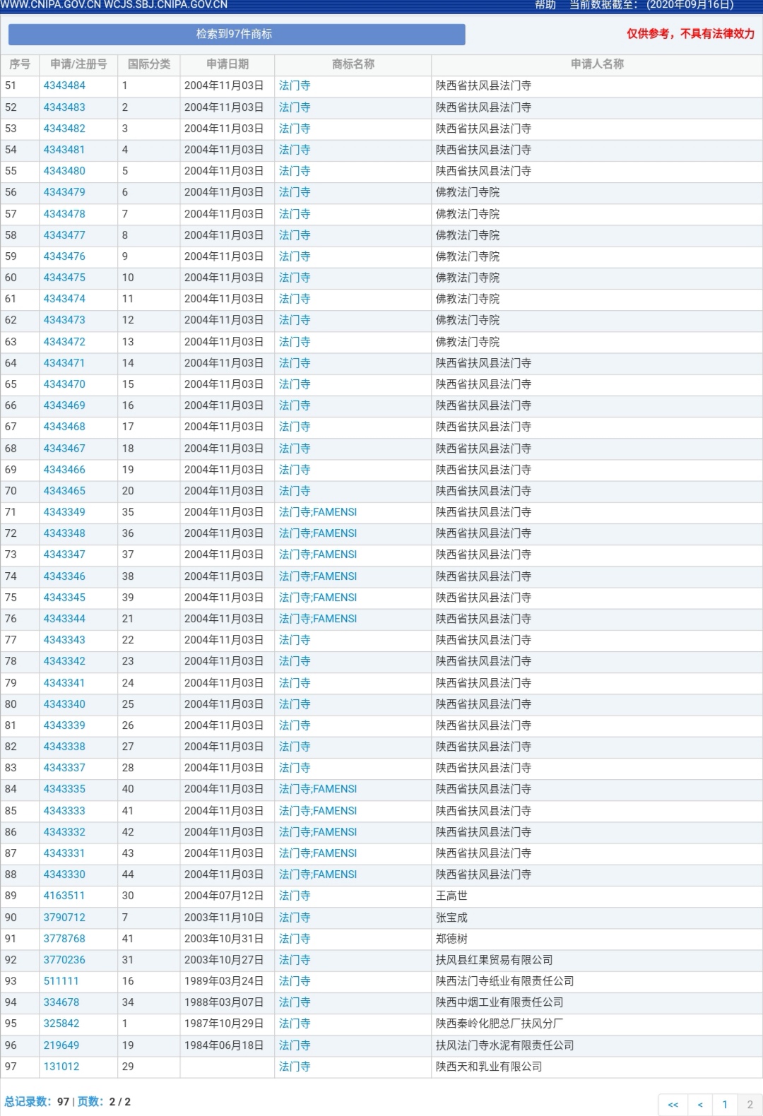 澎湃新闻报道称,作为宗教机构,自上世纪90年代开始,嵩山少林寺广泛布局商标,截至2020年9月13日,23年间一共申请注册666个商标。