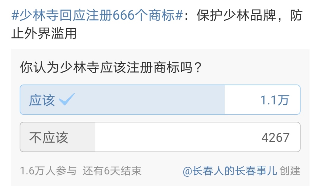 少林寺注册商标在网络引发热烈讨论,在一项“你认为少林寺应该注册商标吗”的微博调查中,超过三分之二网友投票“应该”。