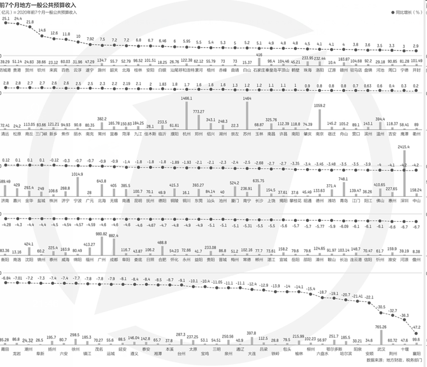 中国政法大学施正文教授对第一财经分析,从170多个地级市财政收入数据来看,地方收入规模和增速差异很大,差异程度超过省级层面数据,这也正是地方财政现状,反映了地方发展的不平衡,也体现了疫情冲击下地方财政收入普遍增长乏力甚至明显下滑,部分基层财政十分困难。