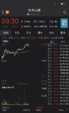 9月23日,农夫山泉延续涨势,现涨逾7%,报39.30港元。