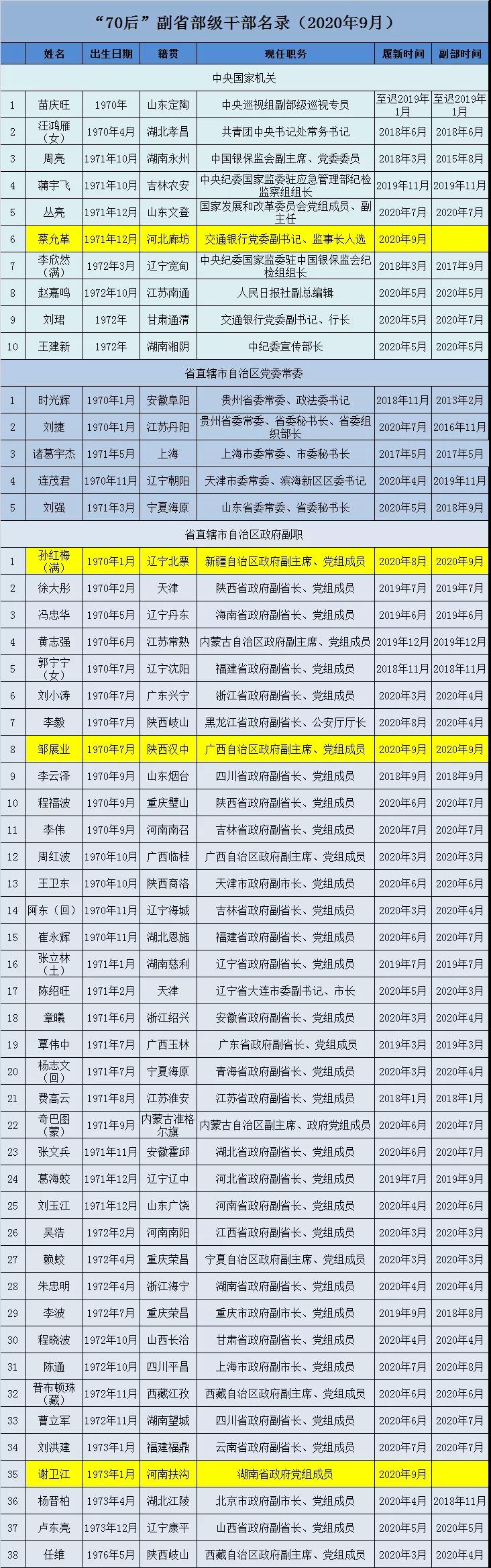 目前,“70后”省副部级干部已达53人。其中,中央国家机关部委及央企为10人,省级地方党委常委5人,省级地方政府副职38人。