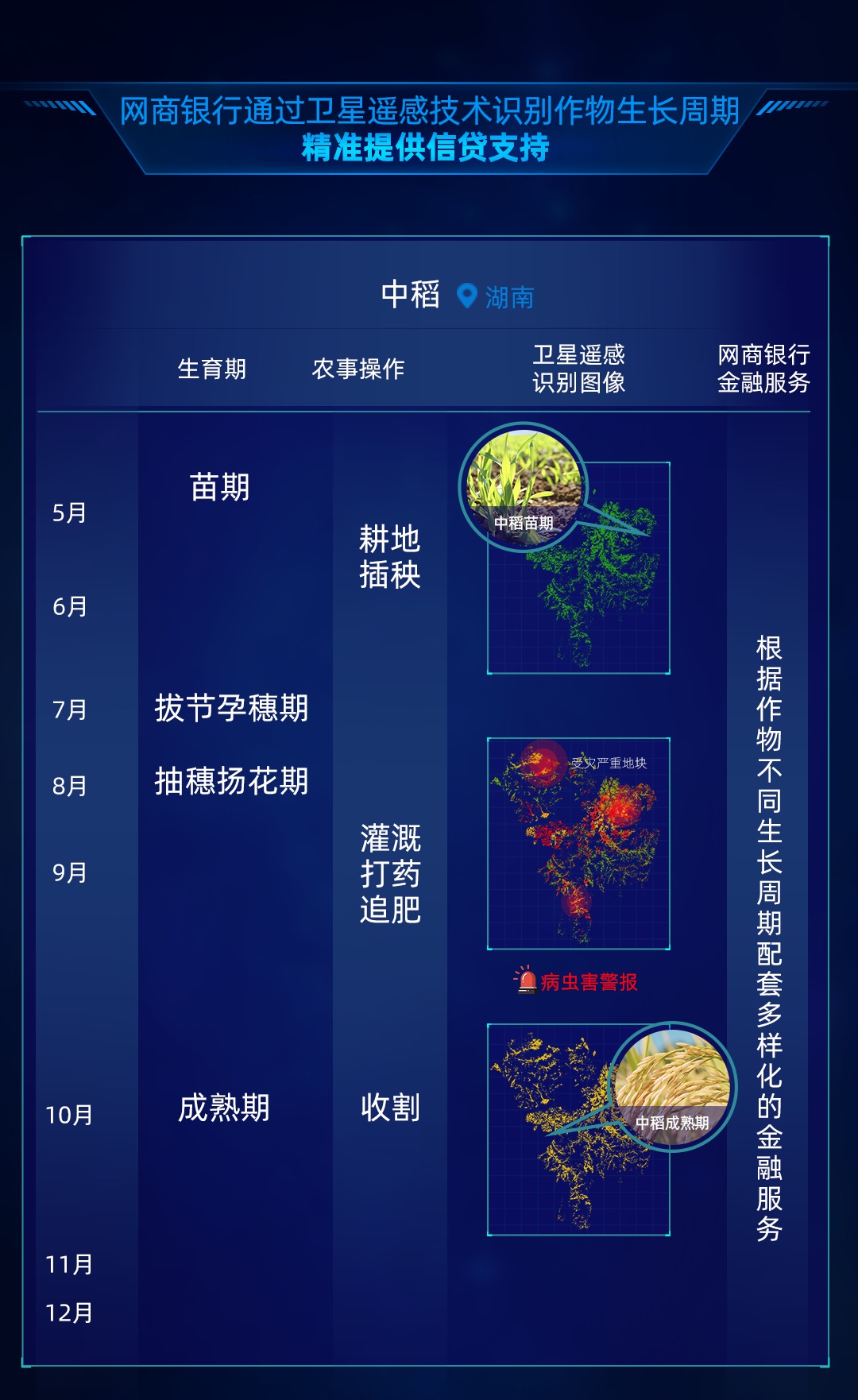 要对信贷风控有帮助,卫星看一次可不够,必须经常观察作物的长势,目前,以五天为周期,网商银行需要实时更新卫星影像和识别结果,监测农作物的长势,判断作物所处的育苗期、拔节期或收割期等阶段,进而分析农户插秧、打药、追肥以及收割时期的不同资金需求。