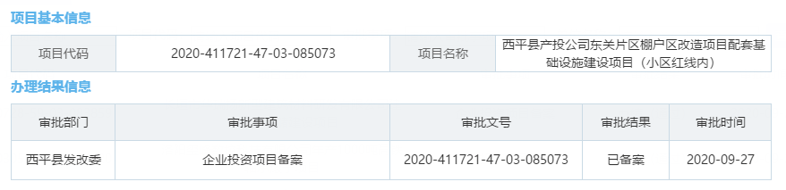 【大河财立方消息】9月27日,据河南省投资项目在线审批监管平台公示消息,西平县产投公司东关片区棚户区改造项目配套基础设施建设项目(小区红线内)获西平县发改委备案。