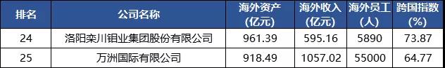 河南的洛阳栾川钼业集团股份有限公司、万洲国际有限公司分别以961.39亿元、918.48亿元的海外资产上榜,排在100大跨国公司榜单的第24位和第25位。