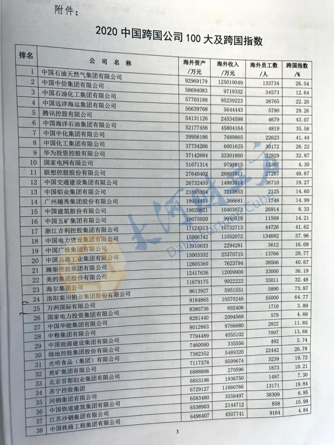 2020中国跨国公司100大榜单中,中国石油天然气集团有限公司以9296.91亿元海外资产位居第一;中国中信集团有限公司、中国石油化工集团有限公司分列二、三位,海外资产分别为5869.40亿元和5770.31亿元。该榜单以三个“500强”榜单为基础,由拥有海外资产、海外营业收入、海外员工的非金融企业,依据企业海外资产总额排序产生。