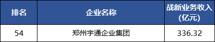 当日还公布了中国战略性新兴产业领军企业100强,郑州宇通企业集团以336.32亿元的战新业务收入排在榜单第54位,也是河南唯一上榜该榜单的企业。排在该榜单前三的分别是华为投资控股有限公司、中国移动通信集团有限公司、苏宁控股集团。