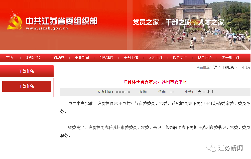 省委决定:许昆林同志任苏州市委委员、常委、书记,蓝绍敏同志不再担任苏州市委书记、常委、委员职务。