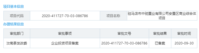 9月30日,据河南省投资项目在线审批监管平台公示消息,驻马店市中驰置业有限公司安置区商业综合体项目获汝南县发改委备案。