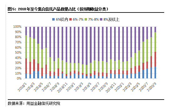 用益信托统计的数据显示,9月收益率8%以上的产品数量占比快速下滑,其他收益区间的集合信托产品的占比有不同程度的上升。据公开资料不完全统计,截至9月30日,在披露预期收益率的795款产品中,预期收益率在8%以上的集合产品的数量占比为10.17%,环比减少10.05个百分点;收益在7%~8%(含)之间的集合产品的数量占比为38.29%,环比增加1.65个百分点;收益在6%~7%(含)之间的集合产品的数量占比为28.21%,环比增加6.30个百分点;6%(含)及以下的集合产品的数量占比为23.33%,环比增加2.10个百分点。