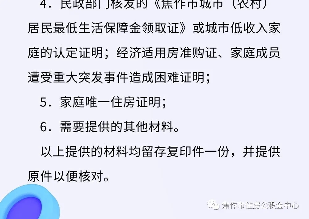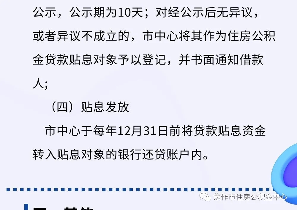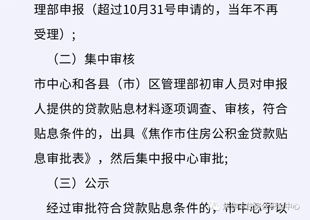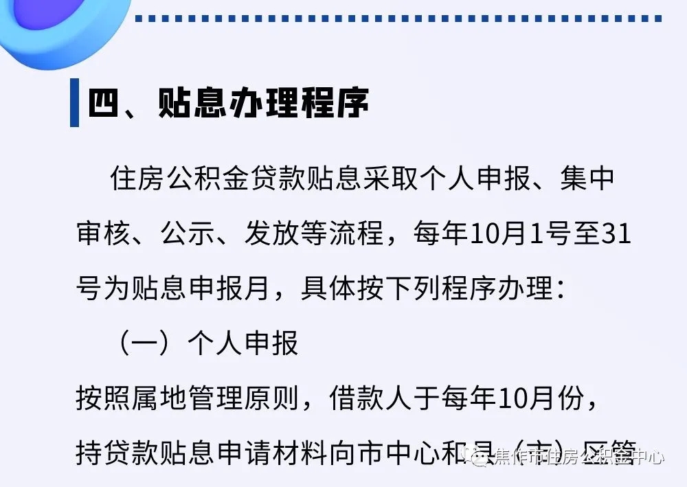 记者了解到,住房公积金贷款贴息采取个人申报、集中审核、公示、贴息发放等流程,每年10月为贴息申报月,申请时间截至10月31日,贷款贴息资金将于当年12月31日前转入贴息对象的银行还贷账户内。申请住房公积金贷款贴息须提供的申请材料为:《焦作市住房公积金贷款贴息申请表》,借款人及配偶工作单位出具《薪资证明》(无工作单位或无收入来源的,由所居住社区或街道审核盖章),借款人及配偶的身份证、军官证、婚姻关系证明,民政部门核发的《焦作市城市(农村)居民最低生活保障金领取证》或城市低收入家庭的认定证明,经济适用房准购证、家庭成员遭受重大突发事件造成困难证明,家庭唯一住房证明及其他相关材料。