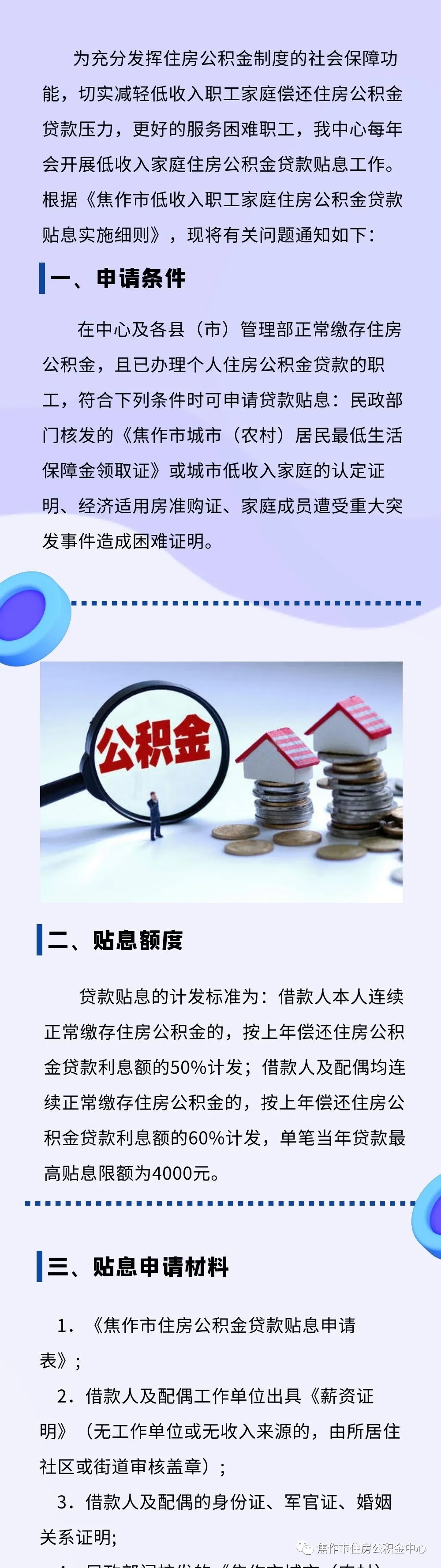 焦作市2020年度住房公积金贷款贴息开始申请,今年申请时间截至10月31日,单笔当年贷款最高贴息限额为4000元。