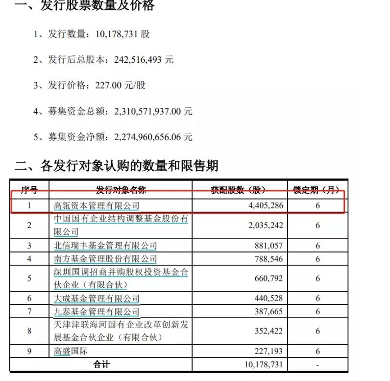 本次发行对象共有9名,其中高瓴资本管理有限公司获配股数为440.53万股,获配金额10亿元,锁定期6个月。