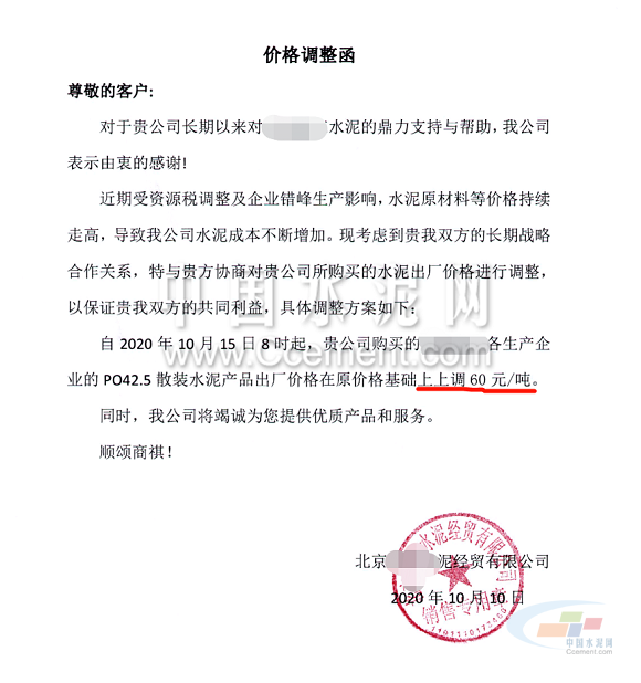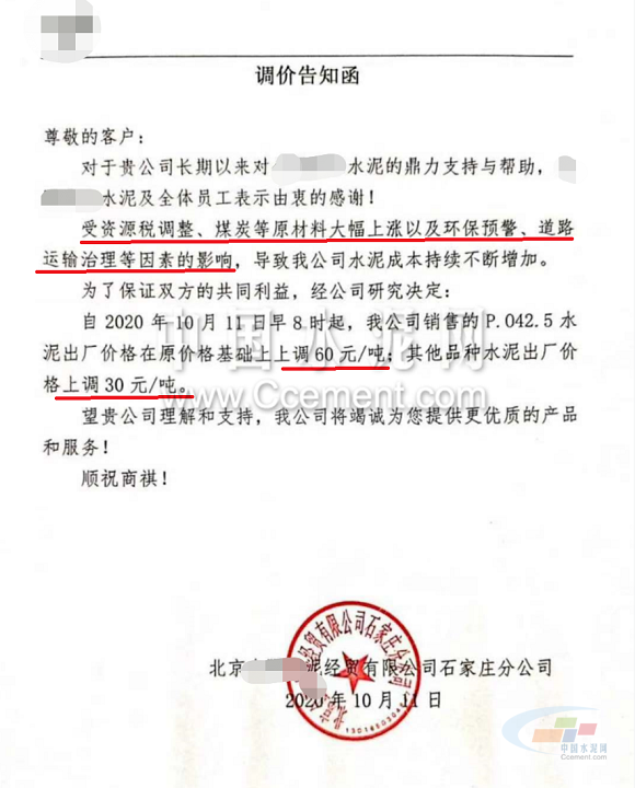 据市场反馈,北方某水泥大厂近日发布涨价函,内容显示,近期受环保预警及道路运输治理等因素影响,水泥价格成本不断增加,公司决定自10月11日早8时起,上调水泥出厂价60元/吨。
