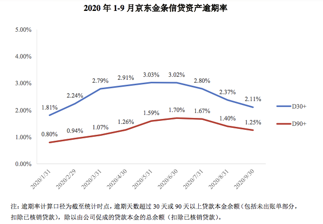 截至2020年6月30日,京东白条资产90天以上逾期率为1.21%,根据风险定价模型确定的分期服务费率为0.50%-1.20%/期(月)。