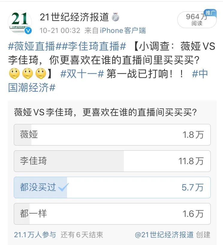 据21世纪经济报道官方微博发布的调查显示,11.8万网友更喜欢在李佳琦的直播间“买买买”,1.8万网友则更倾向于在薇娅直播间购物,还有1.6万网友表示没有明显偏好。