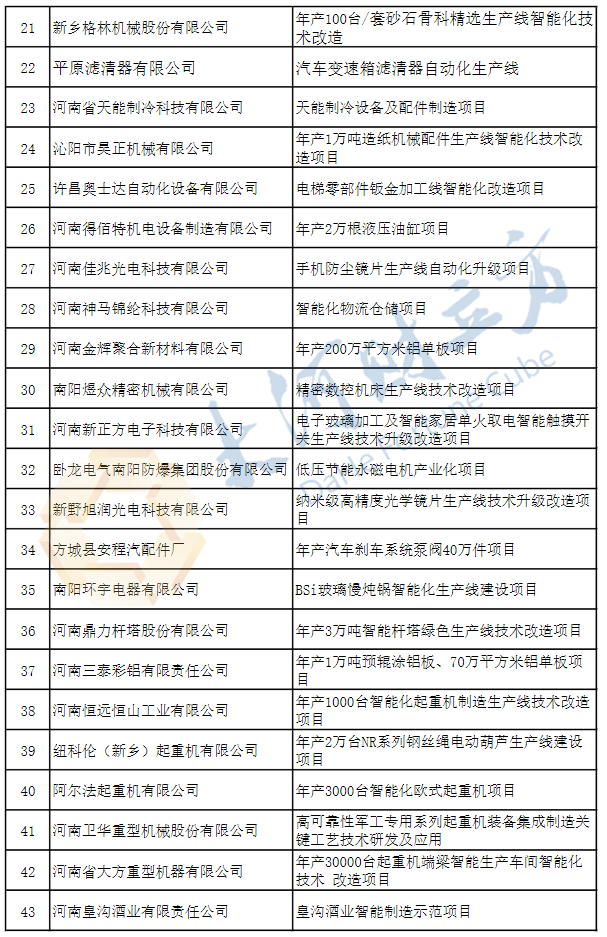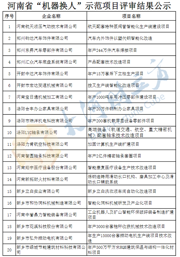 【大河财立方消息】11月5日,河南省工信厅发布河南省“机器换人”示范项目及补贴资金评审结果公示。公示时间为2020年11月5日至2020年11月11日。