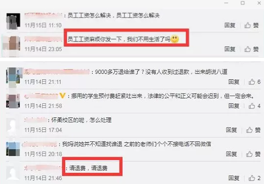 针对优胜教育的承诺,不少家长、员工却不大满意。有的家长留言,只求退还学费;员工则质问:工资什么时候可以发?