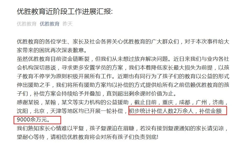 11月15日,“优胜教育”微信号发布阶段工作进展汇报,截至目前,重庆,成都,广州,济南,沈阳,北京,天津等地区均已开展一轮补偿,初步统计补偿人数2万余人,补偿金额9000余万元。