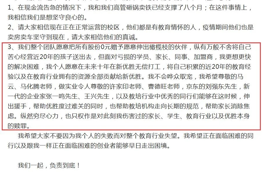 “没想到,一场疫情让我曾经引以为傲的事业瞬间崩塌。”11月5日,优胜教育创始人陈昊发布《一个近20年教育行业创业者的致歉信》称,我们整个团队愿意把所有股份0元赠予愿意伸出橄榄枝的伙伴。他在信中还喊话马云、马化腾、许家印、曹德旺、刘强东、张一鸣、王兴等大佬伸出援手。