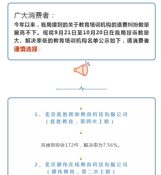 其中,北京海淀区市场监督管理局的消费警示名单显示,北京优胜辉煌教育科技有限公司(优胜教育,第四次上榜)共接到投诉172件,解决率为7.56%;北京东城区市场监管局消费警示名单显示,优胜教育已连续三期登上消费投诉信息公示榜单。