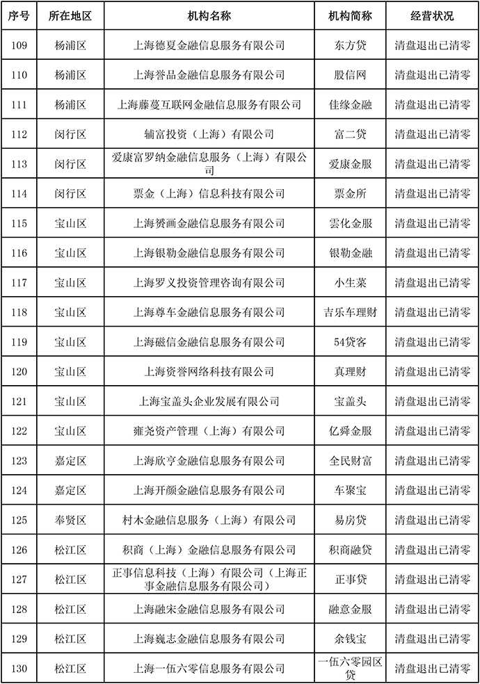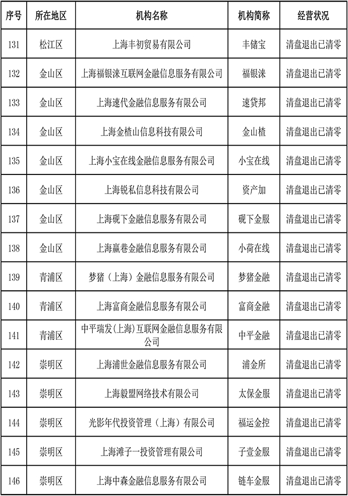 12月4日,根据上海市地方金融监督管理局官网,上海市金融稳定协调联席会议办公室和上海市网贷风险专项整治联合工作办公室发布了《关于上海市P2P网络借贷风险专项整治第一批声明清盘退出且存量已结清网贷机构的公告》,公告显示,上海市第一批声明清盘退出且存量已结清P2P网贷机构达146家。