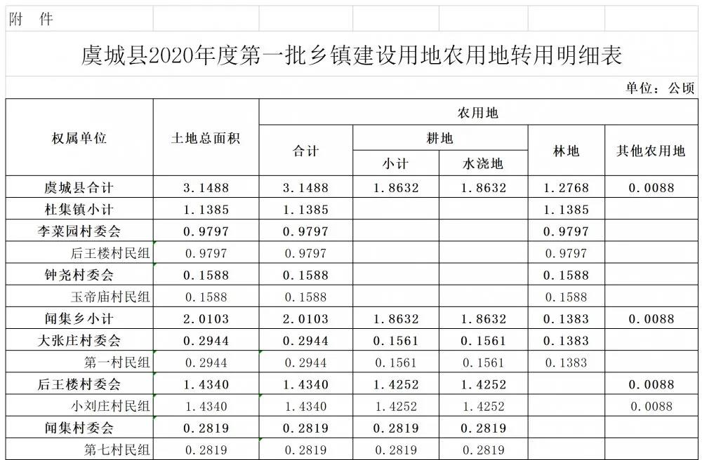 一、同意将虞城县杜集镇等2个镇(乡)李菜园村委会等5个村委会后王楼村民组等5个农村集体经济组织集体耕地1.8632公顷、林地1.2768公顷、其他农用地0.0088公顷,共计农用地3.1488公顷转为建设用地,作为虞城县2020年度第一批乡镇建设用地。