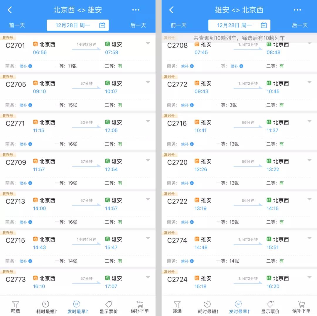 据记者了解,从12月28日开始至1月19日,北京西站与雄安站间日常开行列车11对,大兴机场站与雄安站间每日开行列车5对。其中C2771次运行时间最短,全程运行50分钟(11:15开—12:05到)。