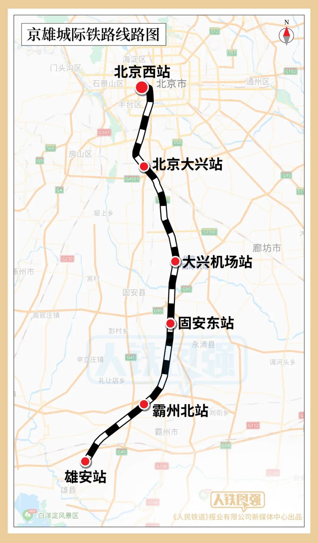 京雄城际铁路自北京西站引出,经过既有京九铁路至李营站,接入新建高速铁路线路,向南途经北京大兴区、河北省廊坊市、霸州市至雄安新区,线路全长91公里,最高设计时速350公里,其中北京西至大兴机场段已于2019年9月26日开通运营。此次开通的大兴机场至雄安新区段长59公里,设大兴机场、固安东、霸州北、雄安4座车站。