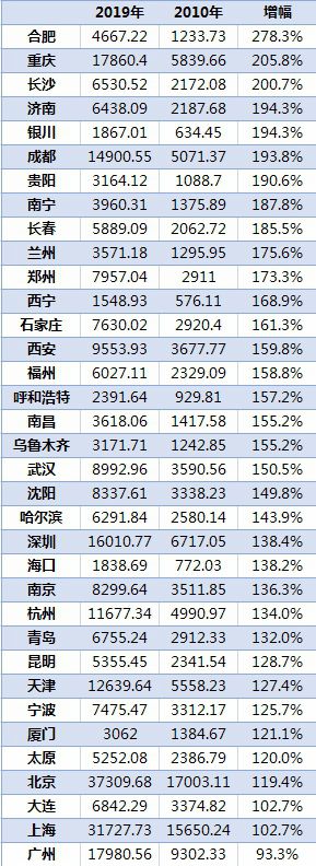 从35个城市(拉萨部分年份数据未发布,故不纳入统计)2010年以来的变化来看,增速最快的城市主要集中在中西部地区,增速前十名的城市分别是合肥、重庆、长沙、济南、银川、成都、贵阳、南宁、长春和兰州,其中8城来自中西部,1城来自东北。排名前三的合肥、重庆和长沙十年增幅超过了200%。