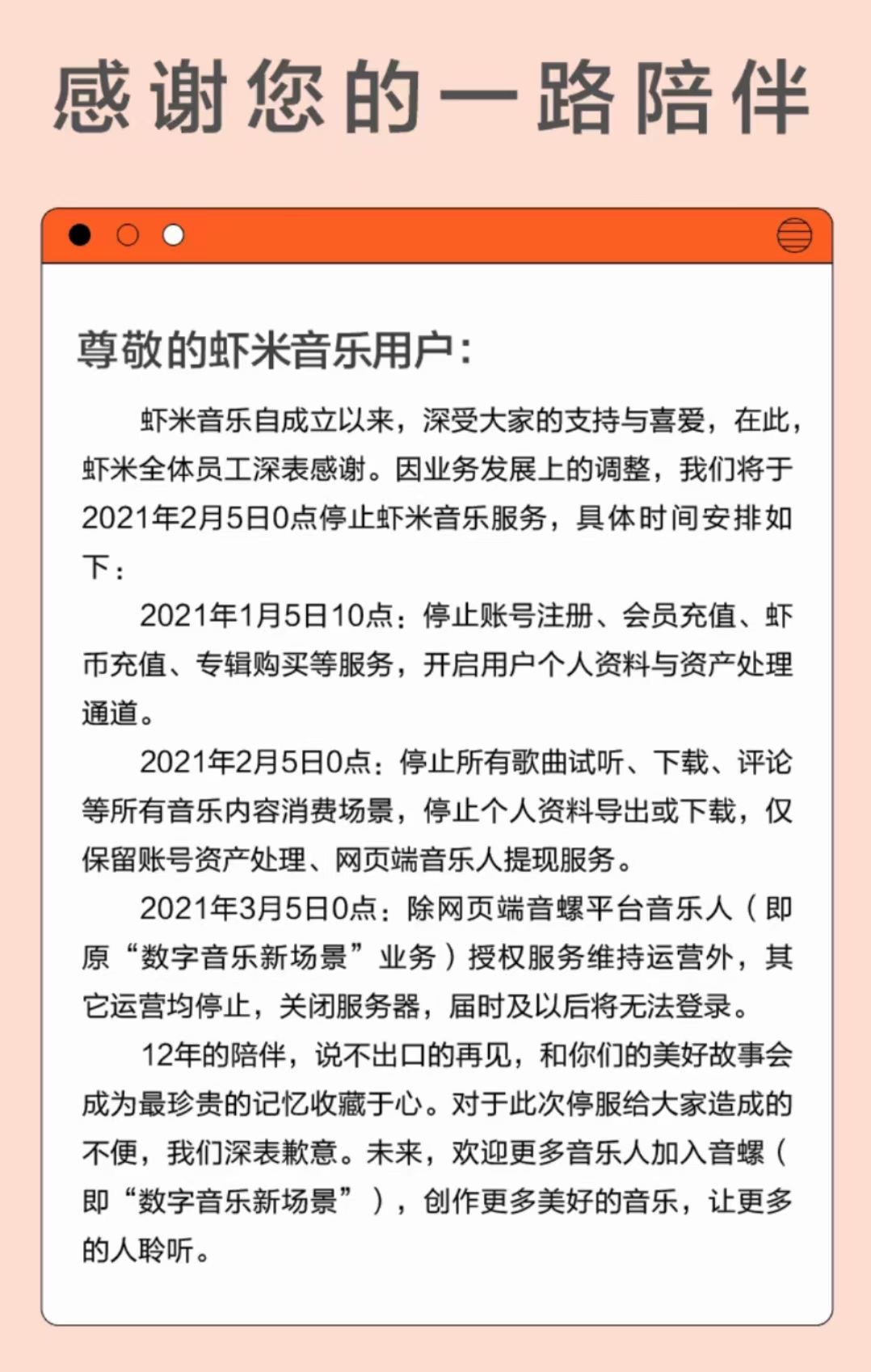 【大河报·大河财立方】(记者 杨霄 文图)1月5日,虾米音乐发布官方声明称,由于业务调整,虾米音乐业务将于2月5日正式停止服务。