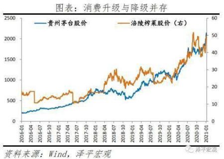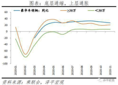 2020年疫情冲击下,结构性问题更加凸显,通胀主要表现为资产通胀,底层通缩与上层通胀并存,消费升级与 消费降级并存。以汽车为例,2020年乘用车零售销量负增长,但高档车销量高速增长,市场份额不断上升。1-11月乘用车累计同比增速-8.3%;其中,30万以下的中低档车累计同比增速-10.2%;而30万以上高档车销量累计同比增速14%,市场份额由2019年的7%上升至9.7%。