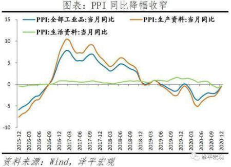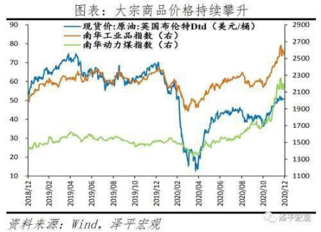 PPI上行主因工业生产持续向好,出口和投资恢复,以及国际大宗商品价格拉动。12月布伦特原油均价环比16.8%, 南华工业品指数环比10.4%,南华焦煤指数环比25.8%,南华动力煤指数环比25.3%,南华螺纹钢环比14.4%,LME铜环比9.8%。