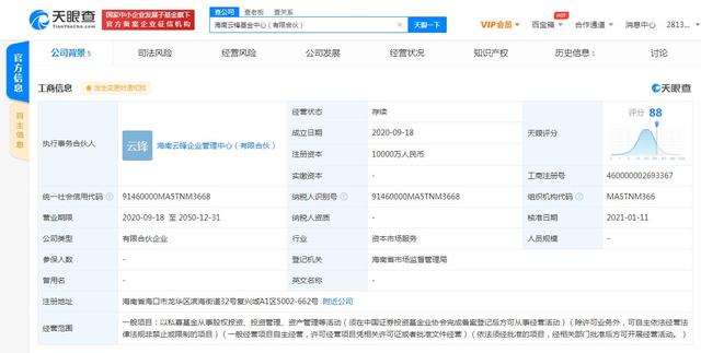 天眼查显示,海南云锋基金中心(有限合伙) 成立于2020年9月,注册资本1亿元,经营范围含以私募基金从事股权投资、投资管理、资产管理等活动等。