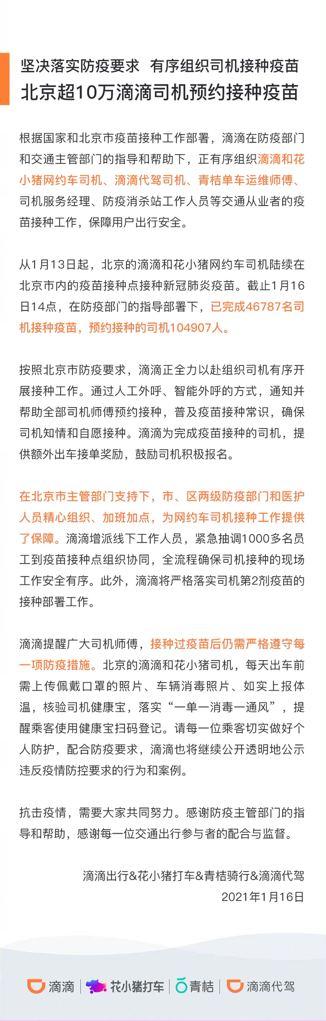 从1月13日起,北京的滴滴和花小猪网约车司机陆续在北京市内的疫苗接种点接种新冠肺炎疫苗。截止1月16日14点,在防疫部门的指导部署下,已完成46787名司机接种疫苗,预约接种的司机104907人。
