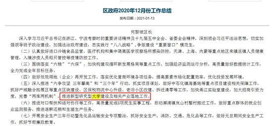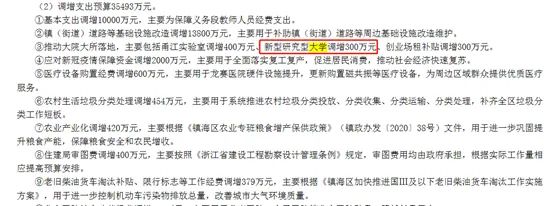 另外,在去年12月份镇海区政府官网公布的《关于2020年镇海区财政收支预计完成情况和财政预算调整方案(草案)的报告》中也提到,要推动大院大所落地,主要包括甬江实验室调增400万元、新型研究型大学调增300万元、创业场租补贴调增300万元。