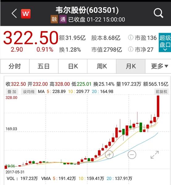 按照1月22日收盘价322.50元计算,虞仁荣持有韦尔股份市值达901.18亿元。
