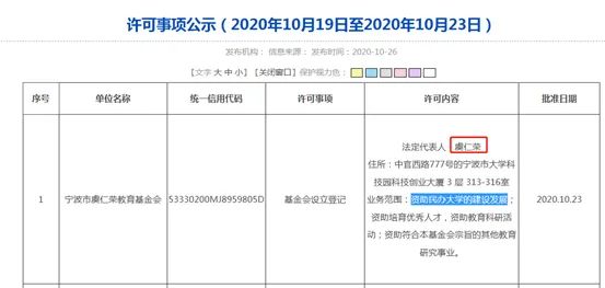 随后,宁波市民政局公布的行政许可事项显示,2020年10月23日,虞仁荣在宁波注册成立了“宁波市虞仁荣教育基金会”,注册资金500万元,其中一项重要内容为“资助民办大学的建设发展”。