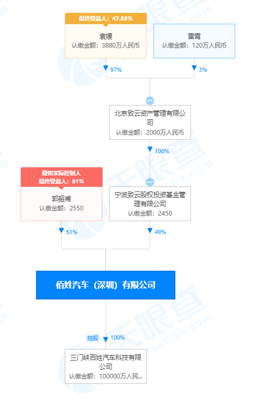 三门峡百姓汽车成立于2020年10月26日,为佰姓汽车(深圳)有限公司的全资子公司,由宁波致云与郭振甫合资成立。