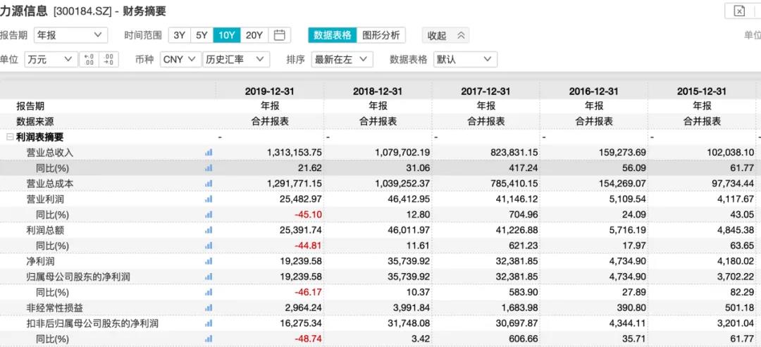 财报显示,2011年-2019年,力源信息实现的归属净利润分别约2419.8万元、1532.77万元、1710.75万元、2031万元、3702.22万元、4734.9万元、3.24亿元、3.57亿元、1.92亿元。也就是说,力源信息2020年迎来上市以来首亏,且亏掉了前9年归属净利润总和。