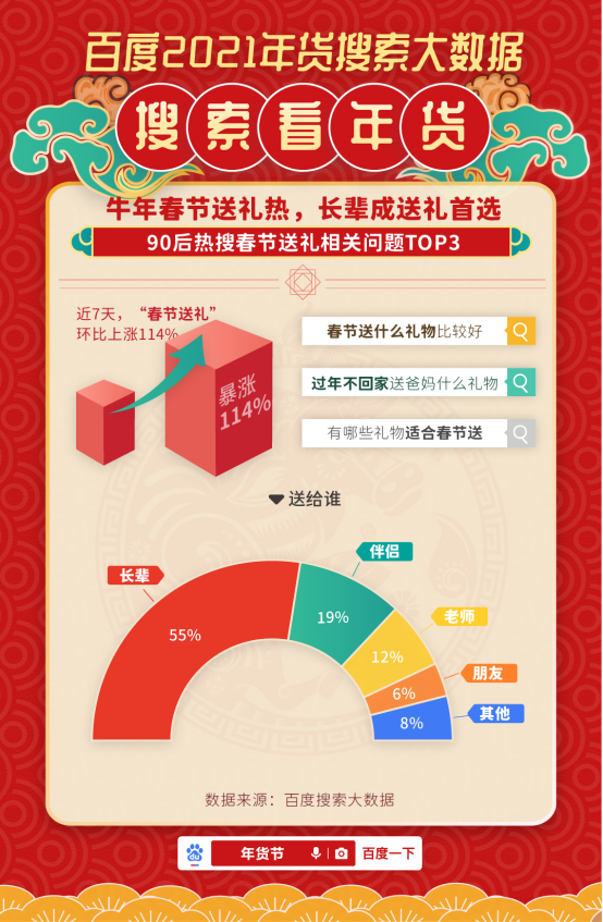 “千里送鹅毛,礼轻情意重。”送礼不仅仅是熟络人情,更会给予彼此真正的关心。百度大数据显示,在年轻人热搜的送礼对象中,长辈位列第一,占比55%,其次是伴侣、老师。此外,朋友也占有一定比重。