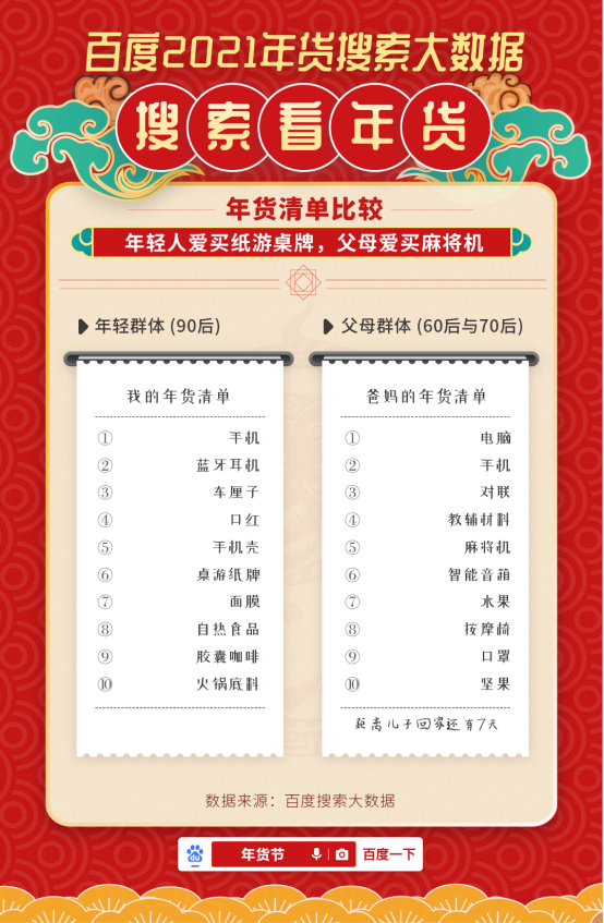 1月27日,百度发布《百度2021年货搜索大数据》,从搜索行为出发描绘中国人年货购置的特点和趋势。“就地过年”的政策呼吁下,90后是线上年货购置主力军,单人年夜饭预订成一线城市主流。买年货,送亲朋,中国人的年货消费里,还藏着许多心思和温馨。