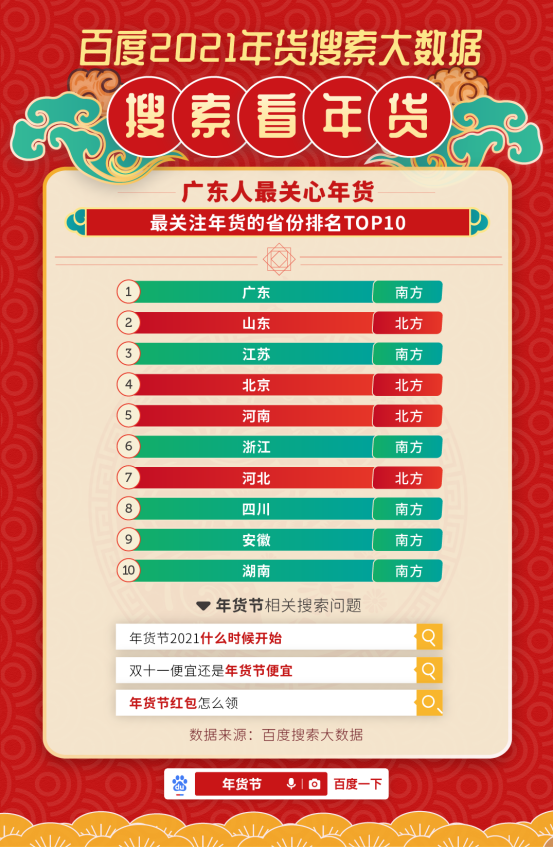 分区域来看,广东人对年货购置的热情值最高,对“年货”相关搜索关注度位列全国第一。其次依次为山东、江苏、北京等地。总体来看,南方省份的积极性略高于北方,不过两者接近。