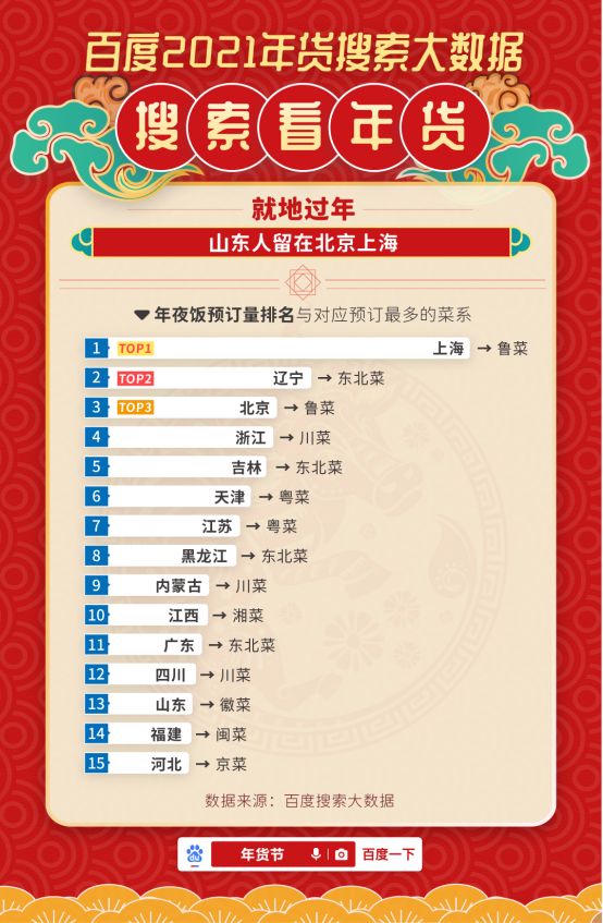 这意味着今年有更多山东人响应号召,留在北京、上海原地过年,预订一场有家乡味的晚餐是他们的选择。与此同时,还有留在浙江的四川人、驻扎天津的广东人,以及滞留广东的东北人。