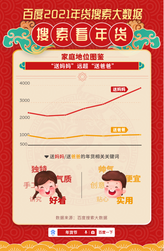 送妈妈的年货相关关键词中,“好看”“气质”与“独特”等词是儿女们的挑选重点。送爸爸的关键词中,则变成了“实用”“便宜”“帅气”等词。不知爸爸们看见这些结果,会不会心生几分苦涩。